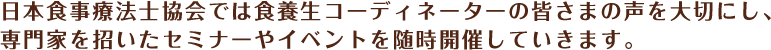 当協会では、受講者を中心に食と健康に関する共通の活動をどんどん広げていきたいと考えております。ご意見ご要望は随時受け付けておりますので、皆さまの学びの場を一緒に楽しく開拓していきましょう。